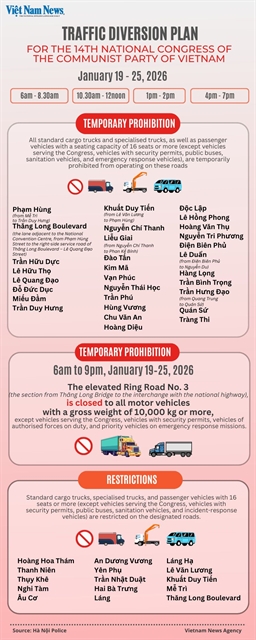 하노이시가 제18차 시당위원회 대회 기간 국립회의센터 주변 교통 원활과 보안 확보를 위해 수요일부터 금요일까지 특정 시간대 차량 통제 및 우회 조치를 실시한다.
