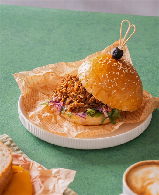 팬 퍼시픽 하노이 로비의 송홍 바에서 셰프 잭 쯔엉이 만든 촉촉한 풀드 포크 샌드위치와 크리미 슬로를 선보인다.