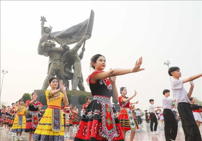 11기관과 학교의 2,200여 명 학생들이 디엔비엔푸 전투 승리 70주년 기념 행사에서 춤추는 무대를 선보였다.