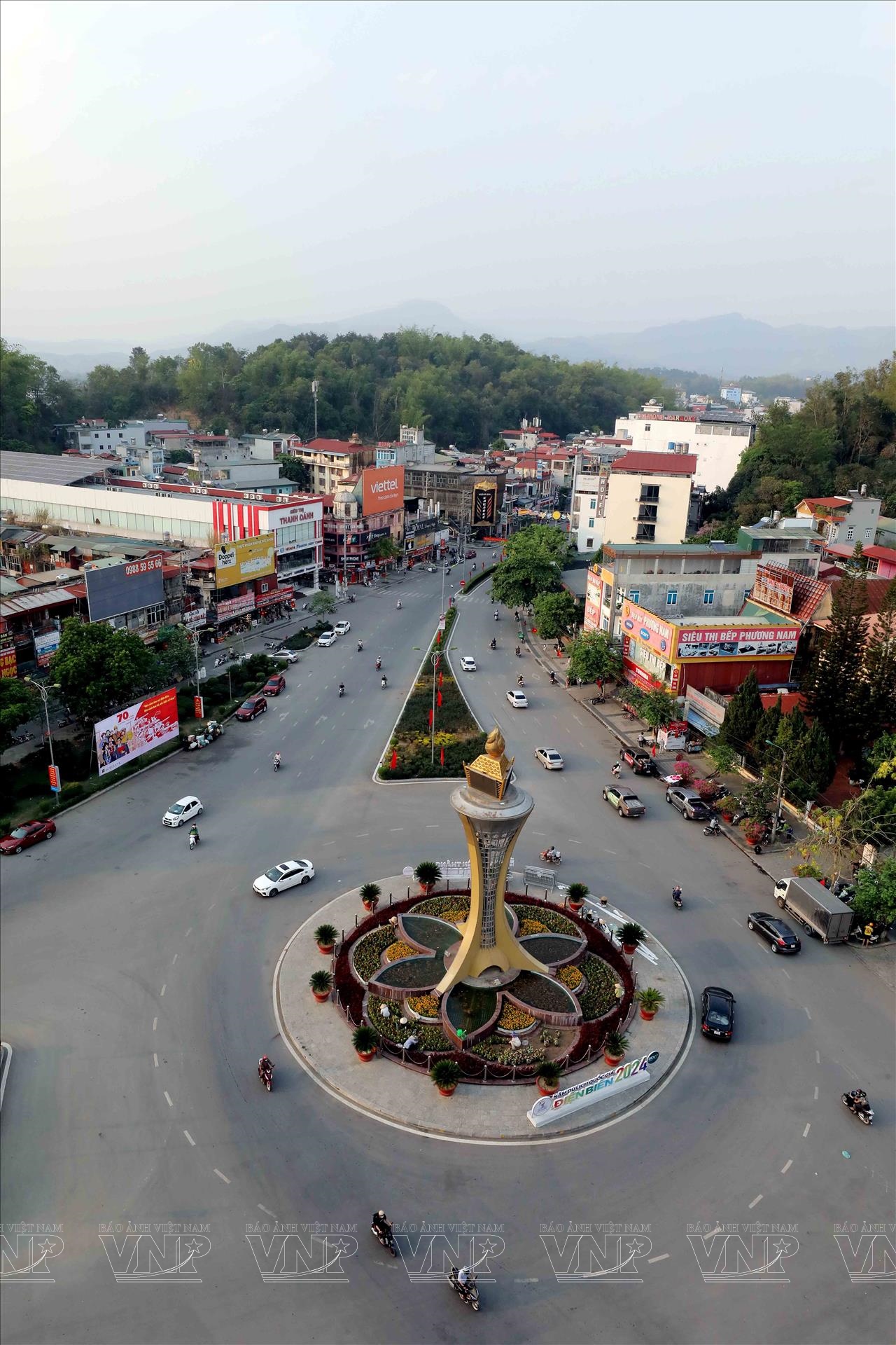 디엔비엔푸 승리 70주년을 기념하는 핵심 공사인 탄빈 다리가 붉은 깃발 아래 빛나며 완공되었음을 보여줌.
