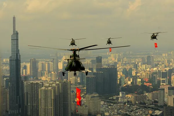 호찌민시에서 오는 50주년 해방 기념 군사 퍼레이드를 위해 10대 헬리콥터와 전투기들이 리허설 비행을 펼쳤다.