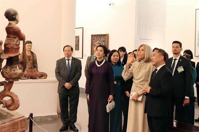 베트남 당 서기장 부인은 프랑스 대통령 부인에게 베트남 미술관에서 국가 유산을 소개하며 문화 교류의 장을 열었다.