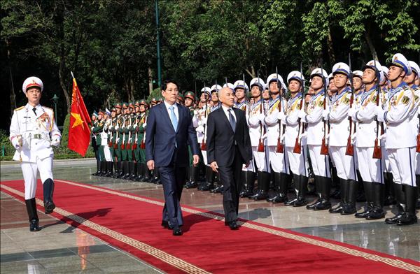 르엉 끄엉 베트남 국가주석이 하노이에서 캄보디아 국왕을 위한 환영식을 주재하며 양국 간 정상 회담을 진행했다.