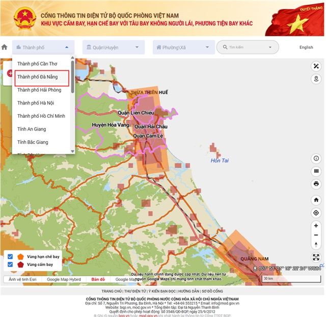 베트남 국방부가 비행 금지 및 제한 구역을 온라인 포털 통해 발표.