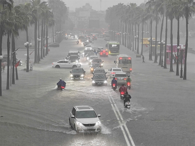 제5호 폭풍의 순환으로 8월 25일 밤 하노이에서 폭우가 쏟아져 도로 곳곳이 침수되고 많은 차량이 고립됐다.